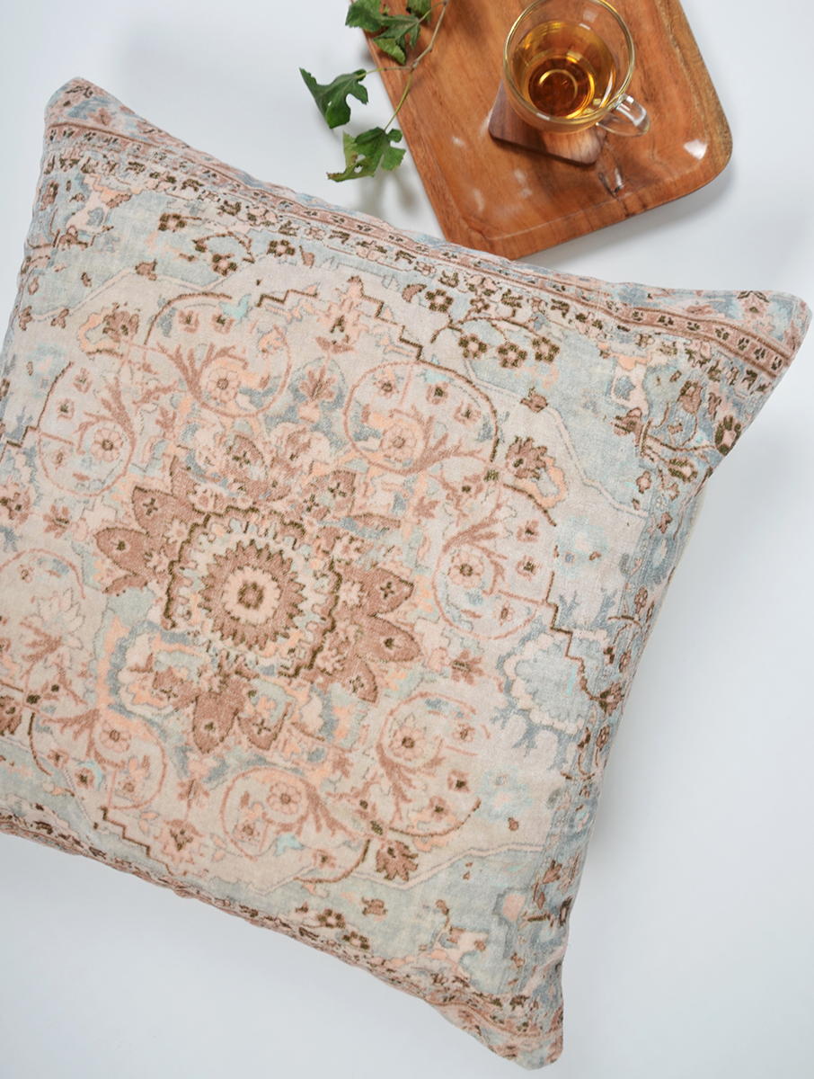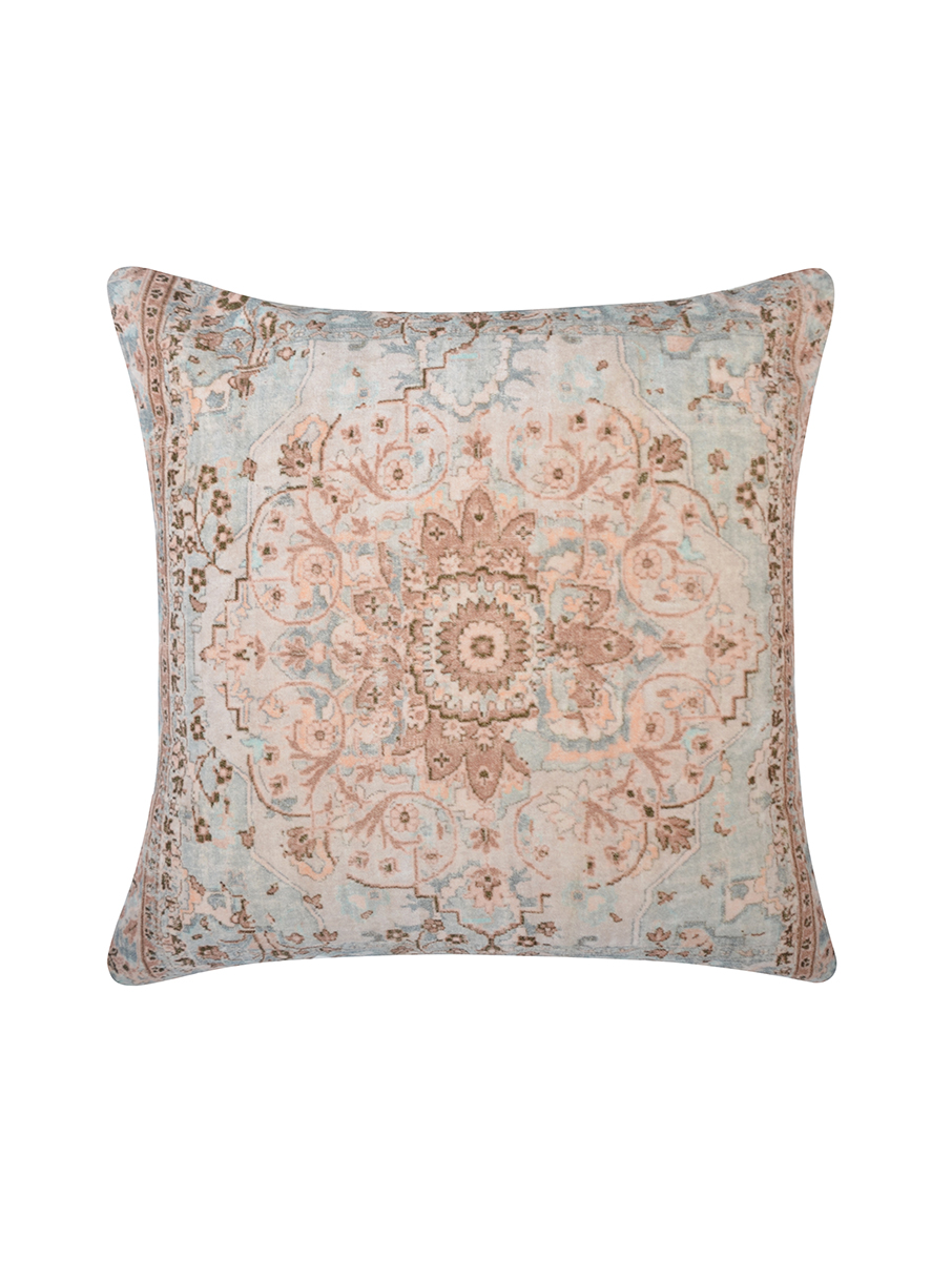 Full of vintage charm, our exclusive Square pillow is printed to look like a distressed Persian rug, bringing classic allure to your home decor. In tones of green and red on the front, this toss pillow has a solid sage-green back and includes a removable insert. This velvet pillow offers a luxe statement to any seat, bed, or chaise – a perfect dash of opulence for the glitz and glamour of the holiday season.