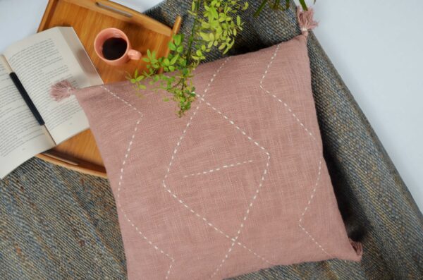 A gorgeous, large square pillow cover covered in delicate hand embroidery and finished with a hand-tied tassel on each corner.