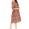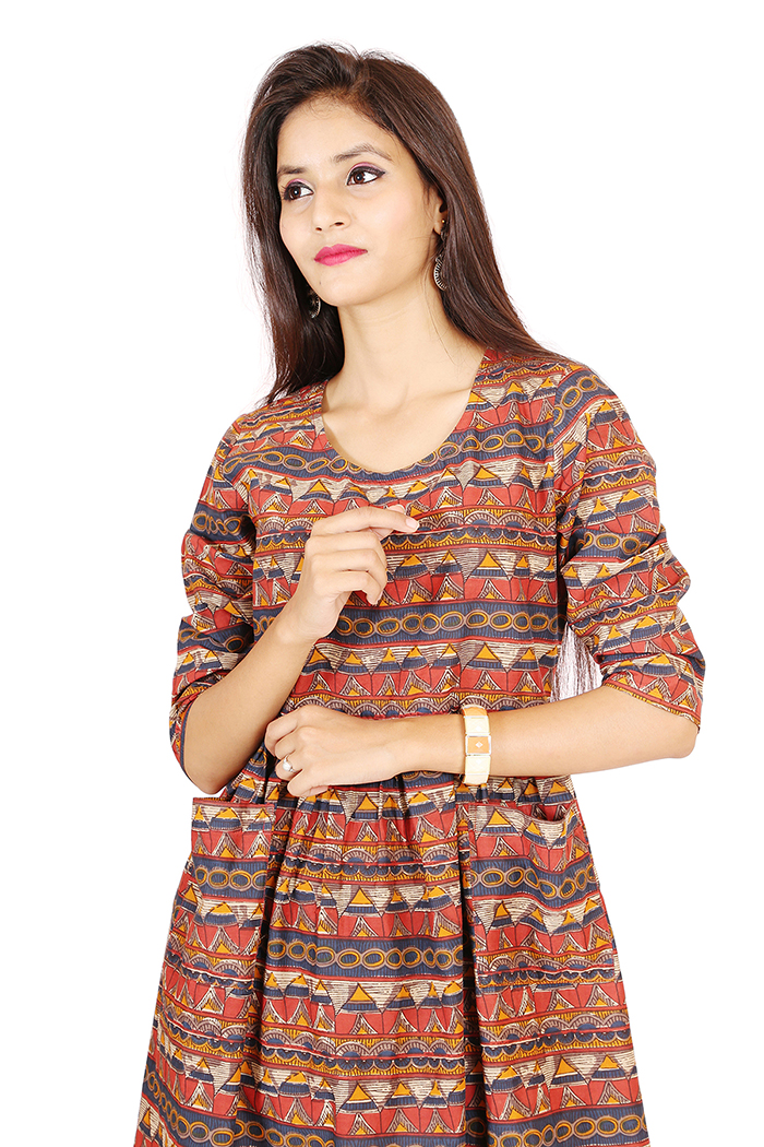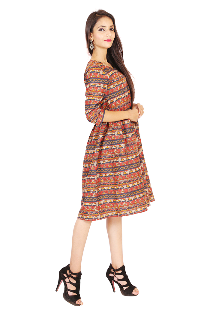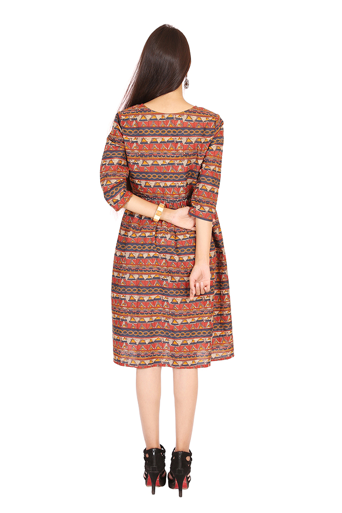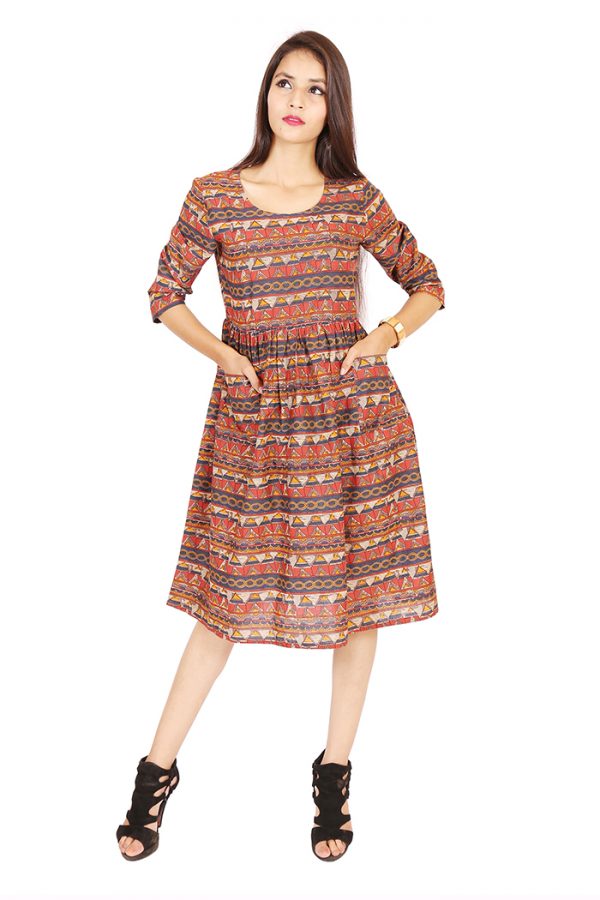 Tribal Print wth front Pocket make this dress fit into your Summer wardrobe. ORNA Presents knee length dress with Round Neck, Three Quarter Sleeves.