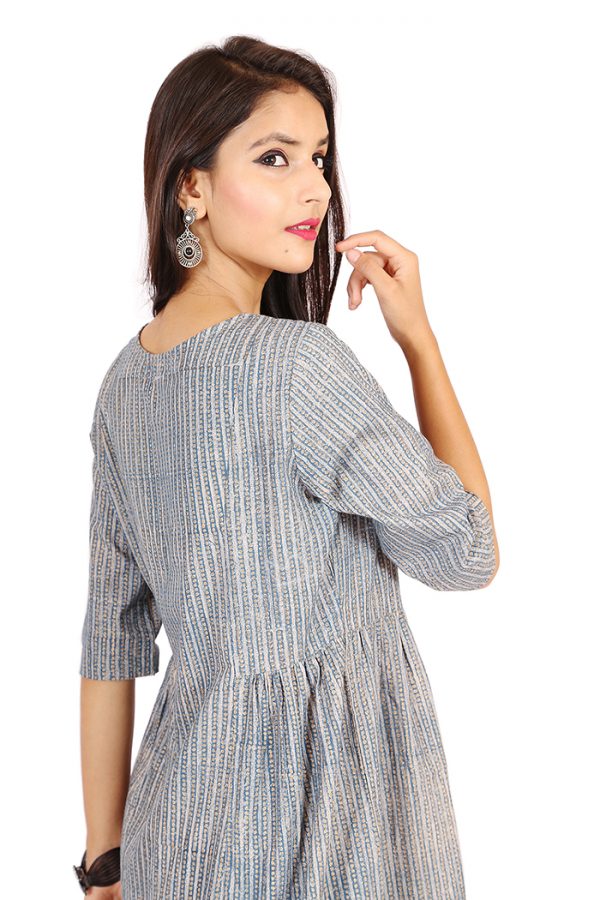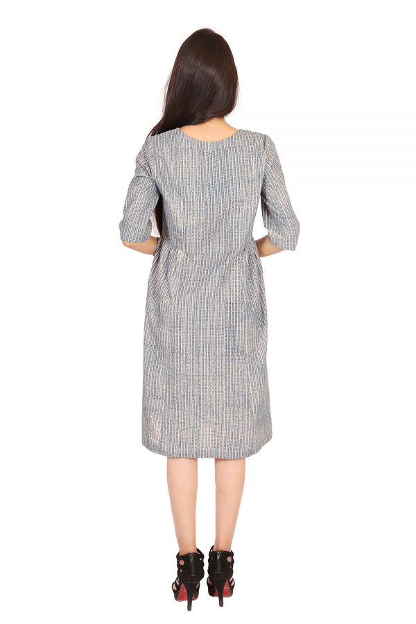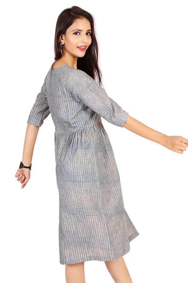 Gold Printed Dress from ORNA, has a round neck,wooden buttons. Featuring a beautiful fusion of geometric and floral print to take 9 to 5 look to a new level this blue gold colored dress by ORNA is a true head turner. This dress further features round neck with 5 wooden button and half sleeves made of premium quality cotton, this dress is high on comfort. Club it with platform heels to look astonishingly charming.