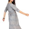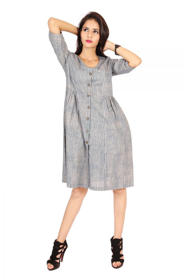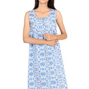 Gold Printed Dress from ORNA, has a round neck,wooden buttons. Featuring a beautiful fusion of geometric and floral print to take 9 to 5 look to a new level this blue gold colored dress by ORNA is a true head turner. This dress further features round neck with 5 wooden button and half sleeves made of premium quality cotton, this dress is high on comfort. Club it with platform heels to look astonishingly charming.