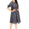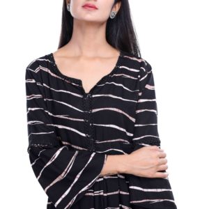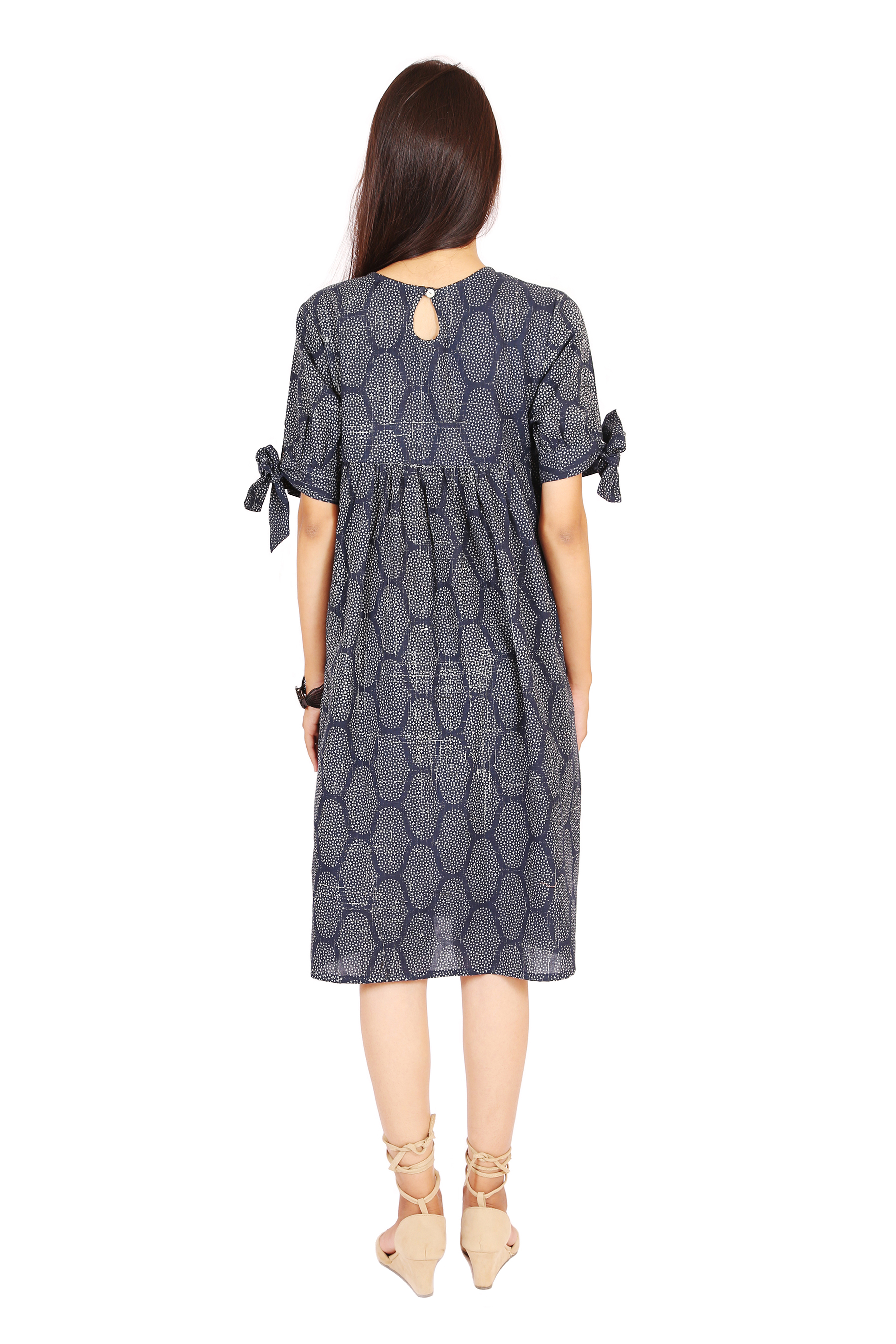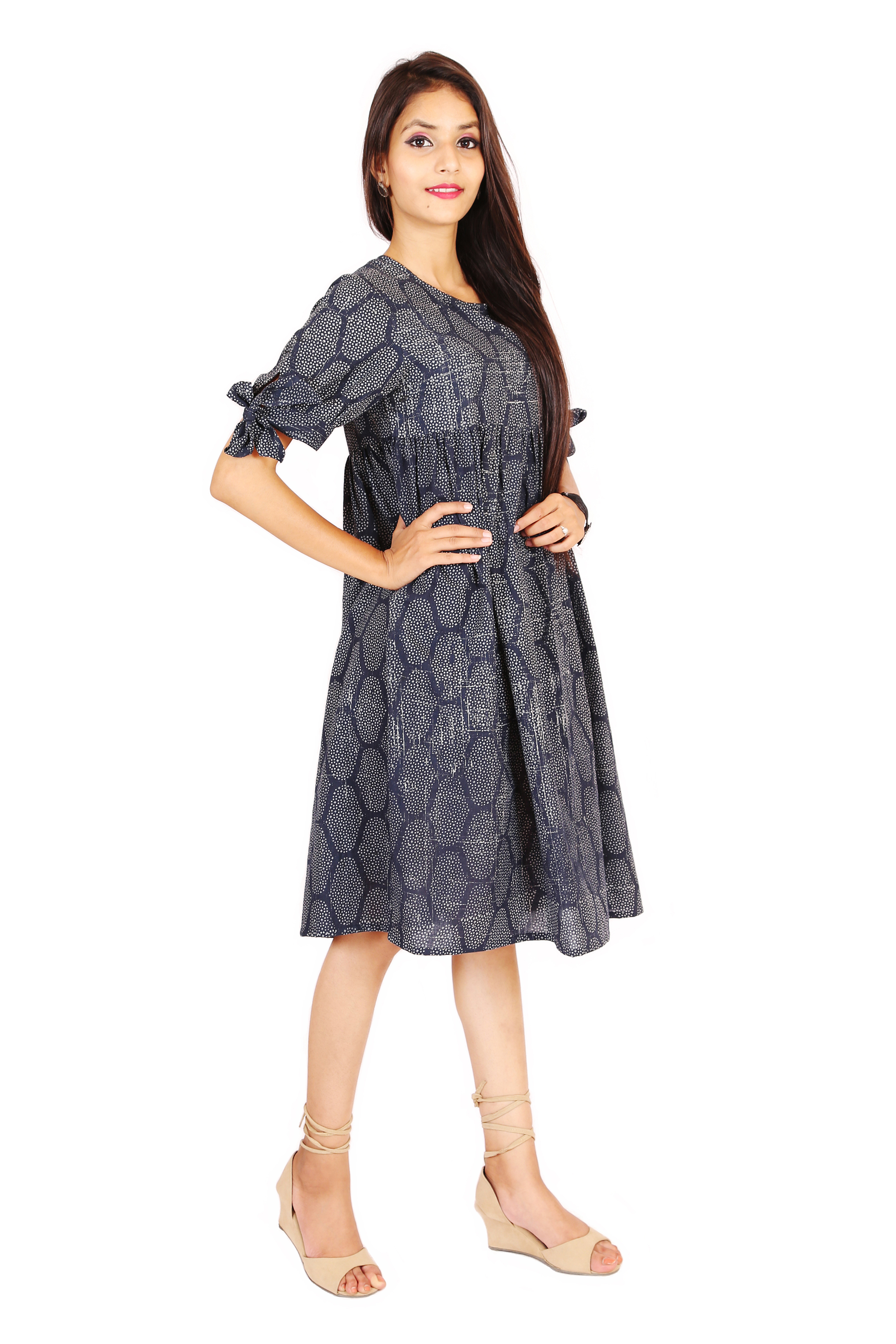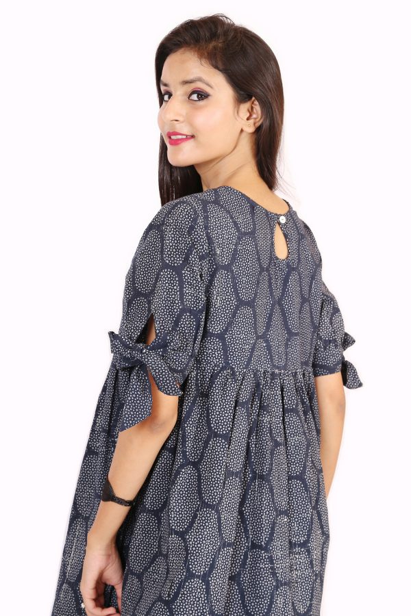 Look trendy with all new ORNA summer Collection. Product have Navy blue color, Round Neck, Bow on Sleeves with Knee length.